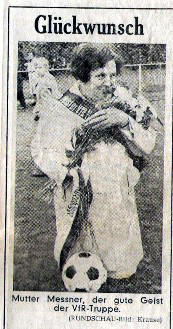 Nicht nur durch sie ist der Name Messener eng mit dem SCE - heute SVE - verbunden. Sohn Horst war viele Jahre Spieler, Trainer und 1. Vorsitzender des Vereins. Heute ist er stellvertretender Vorsitzender und leitet den Förderverein. Sohn Volker war Trainer der ersten Mannschaft. Ab 1928 bis zum vergangenen Jahr trainierten die Fußballer auf ihrem Sportplatz, dem "Dasbecker". Dann erwarb die Hammer Gemeinnützige Baugesellschaft (HGB) den Platz von der Stadt Hamm, um das neue Wohngebiet zu entwicklen. Im Gegenzug erhielt der Verein von der Stadt Hamm eine Zuschuss, um im Marienstadion einen Kunstrasenplatz bauen zu können. In ihrer jüngsten Sitzung beschloss die Bezirksvertretung Heessen einstimmig, die Straße in diesem Wohngebiet nach Anneliese Messner zu benennen. ▪ P.Sch./jim aus WA- Online vom 02.08.2012 18.05.1969 War das eine Nervenschlacht. Freunde, der Fußball feierte seine Triumphe, Himmelhochjauchzend die einen, mit hängenden Köpfen die anderen. VFR Heessen ist Meister. Jubelnd störmten nach dem Schlusspfiff die Heessener Fans das Spielfeld. Fußballbräute lagen sich in den Armen. Und Mutter Messner, dem guten Geist der Rasensportler, rannten die Tränen herunter. Udo staunte, ob so viel Teilnahme an dem großen Erfolg einer Fußballelf. Freunde, wer dieses Match am Altenbögger Rehbusch gesehen hat, kann nur die Feststellung treffen, das der Fußball nicht nur rund ist, sondern sagenhafte Spannung, Kampf, Spielwitz, lachende und enttäuschte Gesichter vereint.Sekt, Bier und Wein flossen abends in Heessen in strömen. Natürlich mischten die munteren Frauen fleißig mit. Und eine sportliche Geste, den Glückwunsch vom Nachbarn TuS Heessen für VFR, stellte gestern im Trubel fest |
