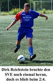 und wurde von seinem Gegenspieler umgerannt. Beim fälligen SVE IV: Wellenbüscher – Licina – Philippi, Aydemir – Christian Ahlke (36. Sendek), Bauer, Oppotsch, Kromrei – Reichstein – Carsten Ahlke (83. Stegemann), Wolfertz (65. Kemper) |