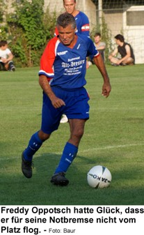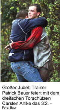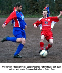 scheiterte Spielertrainer Patti Bauer mit einem Kopfballaufsetzer. Auch Carsten