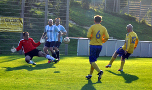 Turnier in Hultrop ohne Gegentor Nah dran waren sie schon einmal, doch zum großen Coup hat es in Hultrop bislang nicht gereicht. Zumindest nicht bis Freitag, denn da sicherte sich der SVE Heessen den Turniersieg im Lippetal. Sechs Siege in sechs Spielen sowie 10:0 Tore lautet die überragende Bilanz. Los ging es für die Heessener gegen die Gastgeber. Toto Kron gelang auf Vorarbeit von Nedzad Bajric das 1:0. Sascha Frey eroberte sich den Ball und marschierte unaufhaltsam zum 2:0. Gegen den SC Eilmsen ließ der SVE viele Chancen aus. Bajric verwertete schließlich kurz vor Schluss eine Ecke von Jens Messner zum 1:0-Siegtor. Seine Überlegenheit in Tore münzten die Heessener gegen den VfJ Lippborg in Tore um. Kron traf nach Pass von Bajric mit einem haltbaren Schuss zum 1:0. Bajric leitete auch das zweite Tor ein. Adi Pander legte vor dem Torhüter noch einmal quer und Sascha Frey vollstreckte. Nach einer schönen Einzelaktion von Pander drückte Andreas Pastrick den Ball zum 3:0-Endstand über die Linie. Nach diesem souveränen Start waren die Heessener gut auf Kurs, zumal sich die anderen Teams fleißig gegenseitig die Punkte abnahmen. Der SVE setzte seinen Siegeszug dagegen fort. Das 1:0 gegen den SuS Günne war schmeichelhaft für den Gegner. Die Heessener ließen einige Möglichkeiten liegen. So fehlte nur noch ein Erfolg zum Gewinn des Turniers. Eickelborn, das nur mit fünf Feldspielern angetreten war, erwies sich allerdings als unerwartet schwerer Brocken. Zwar traf Nedzad Bajric nach einem Alleingang elegant mit der Picke, doch anschließend zitterte sich der SVE zum Sieg. Nach Foul von Olaf Wyludda parierte Torhüter Tim Fischer den Neunmeter – der Nachschuss ging an den Innenpfosten. Ein Solo von Patti Bauer mit einem Schlenzer in den Winkel entschied dann die Partie. Der Turniersieg war eingetütet, doch jetzt wollten die Heessener auch alle Spiele gewinnen. Doch die fünf Partien vorher hatten Kraft gekostet. Der SVE versuchte das Tempo raus zu nehmen. Das 1:0-Siegtor fiel allerdings, als einmal schnell agiert wurde. Wyludda und Kron spielten einen schönen Doppelpass, und den Querpass von Wyludda bugsierte ein Lippetaler unhaltbar ins eigene Netz. Kurz darauf parierte Fischer stark gegen einen freistehenden Gegner und blieb so das gesamte Turnier ohne Gegentor. Ergebnisse:SVE – SW Hultrop 2:0 SVE – SV Eilmsen 1:0 SVE – VfJ Lippborg 3:0 SVE – SuS Günne 1:0 SVE – BW Eickelborn 2:0 SVE – SC Lippetal 1:0 Scorerpunkte Tore: Nedzad Bajric 2, Toto Kron 3, Sascha Frey 2 , Andreas Pastrick 1 , Patrick Bauer 1 , Eigentor 1 Vorlagen: Nedzad Bajric 2, Adi Pander 2, Olaf Wyludda 2, Jens Messner 1 |
